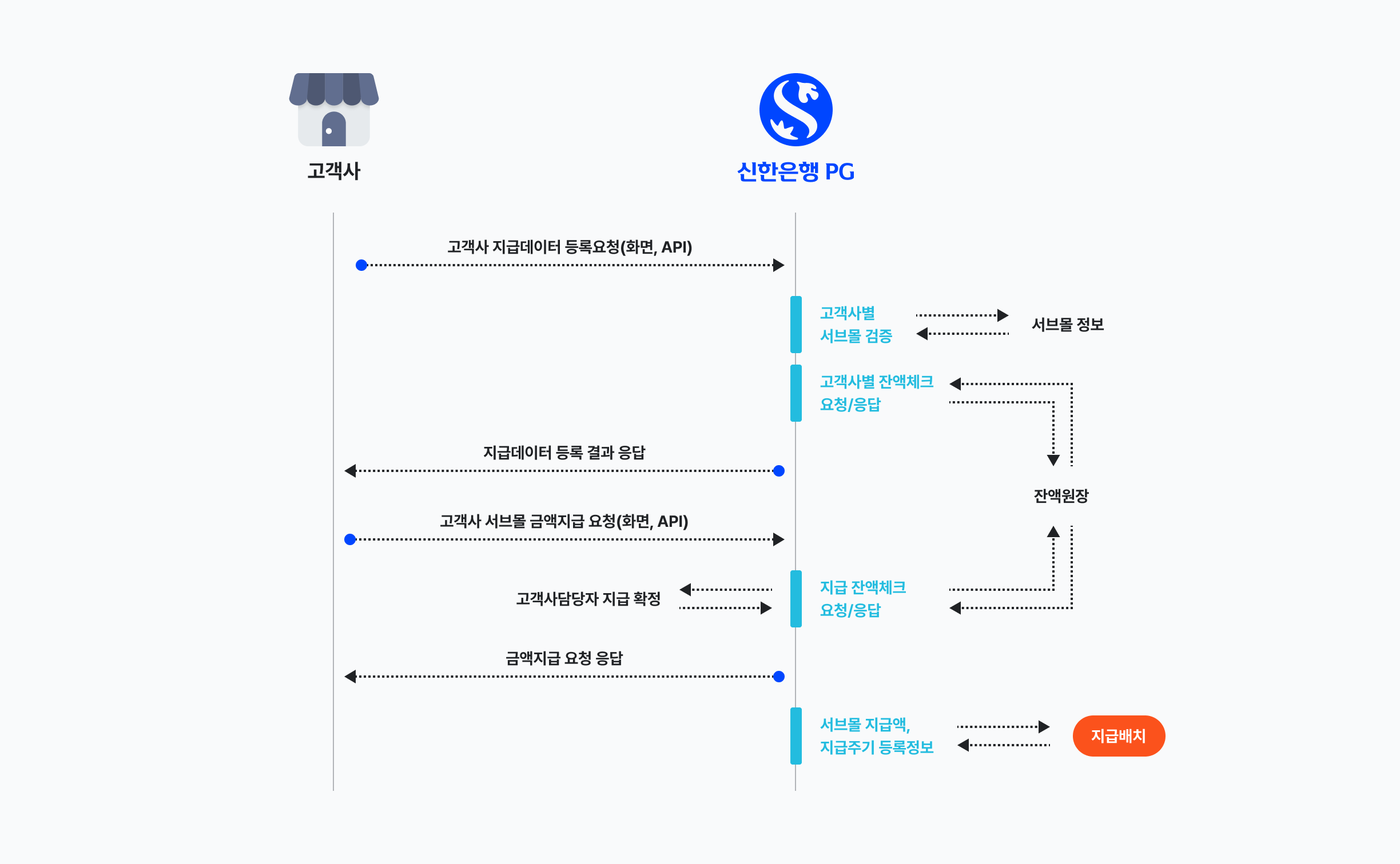 고객사에서 지급 데이터 등록을 요청하면 고객사 별로 등록된 서브몰을 검증하고, 고객사 별로 잔액을 체크하여 지급 데이터를 등록합니다.